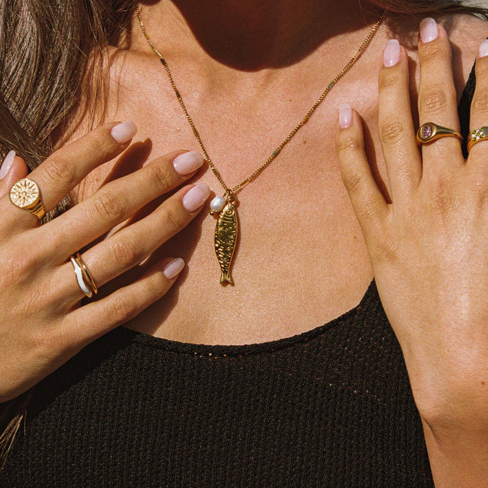 A golden fish, a tiny pearl, and a whole lot of charm. The Fish Necklace adds instant vacation vibes,  get ready for nonstop ‘Where’d you get that?
