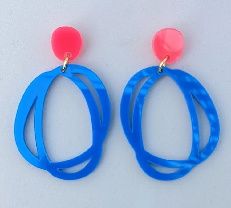 Large, dangly swirl earrings inspired by CMAT. Bursting with bright, fun colours, these earrings have lovely movement and make a playful statement. Finished with gold plated, nickel free studs, they are super lightweight and comfortable to wear. Each pair comes in its own pale pink display box, making them perfect for gifting. Neon pink tops with electric blue swirls add a bold, vibrant touch.
