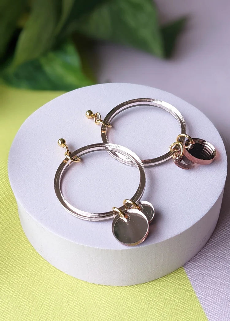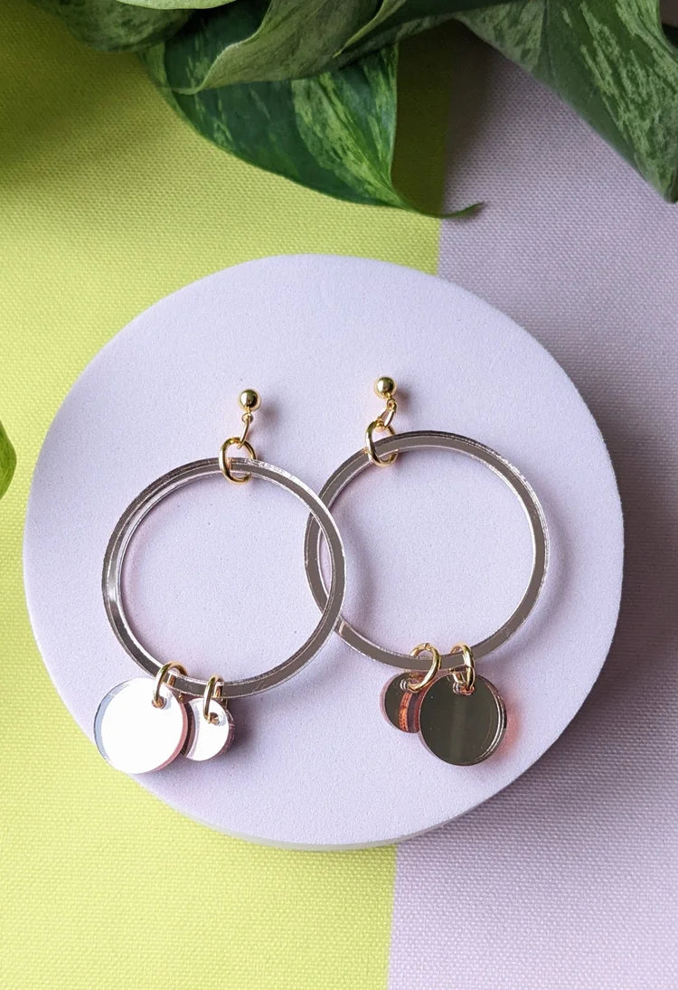 These dangly hoops feature a delicate acrylic circle with matching acrylic dots, creating lovely movement and a playful, eye-catching style. Finished in mirrored rose gold, they are super lightweight and comfortable, making them the perfect statement accessory for any outfit.