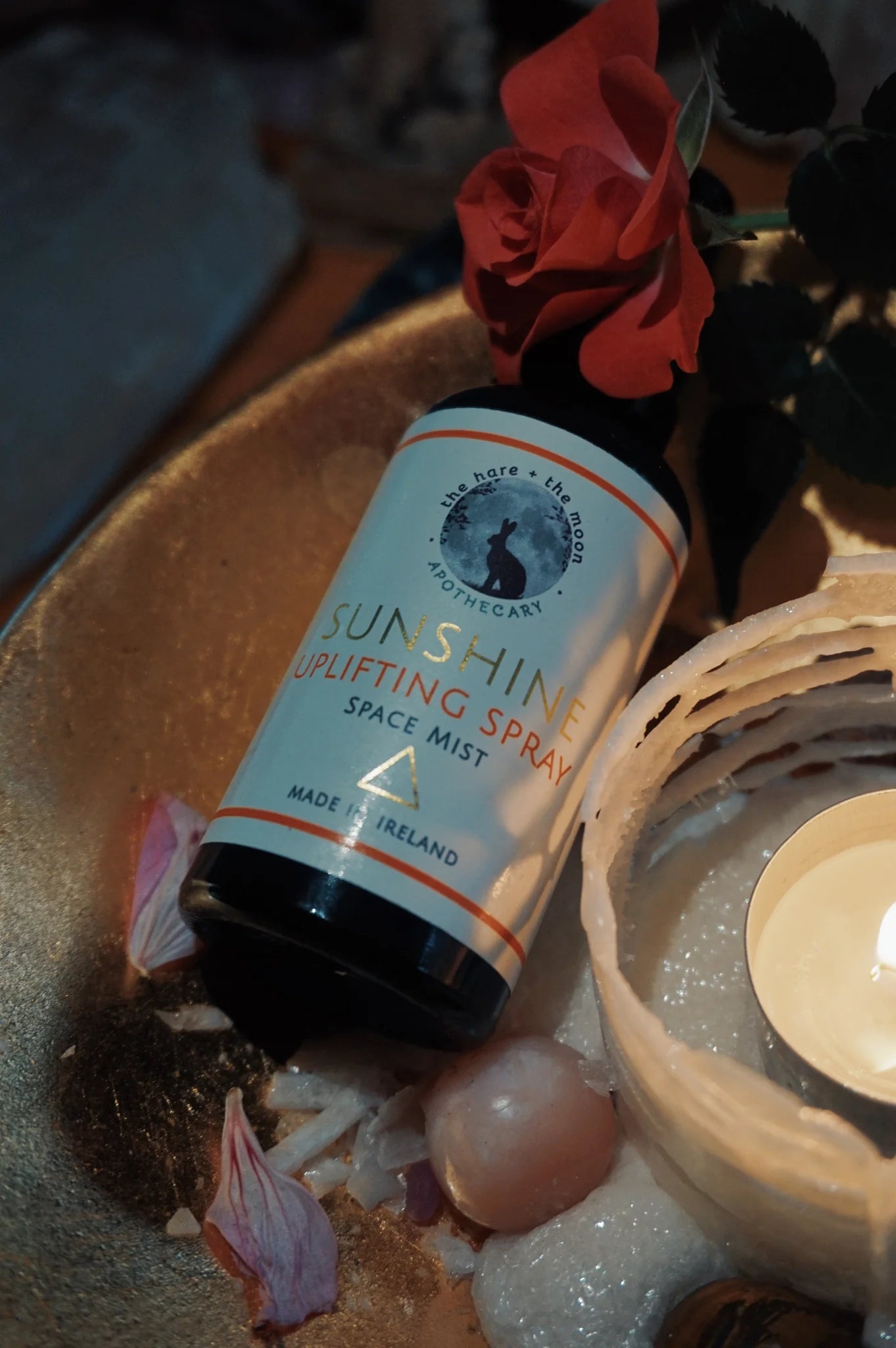 The Hare + The Moon Apothecary - Sunshine Uplifting Spray, 50ml. A stimulating blend of essential oils and hydrosols designed to uplift, revitalise and energise. With the scents of neroli, sandalwood, bergamot and other grounding botanicals, this blend helps you feel connected to nature and to yourself.