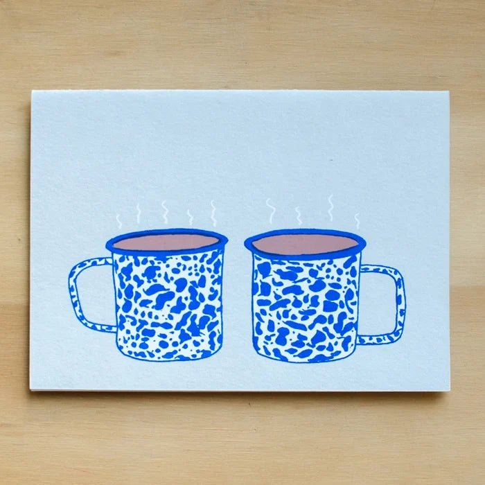 Enamel Cups Greeting Card 4.5" x 6.25" blank card. Comes with an envelope in a protective cellophane bag. Hand designed and screen printed on 100% cotton rag archival gray paper in our studio in Bellingham, WA.