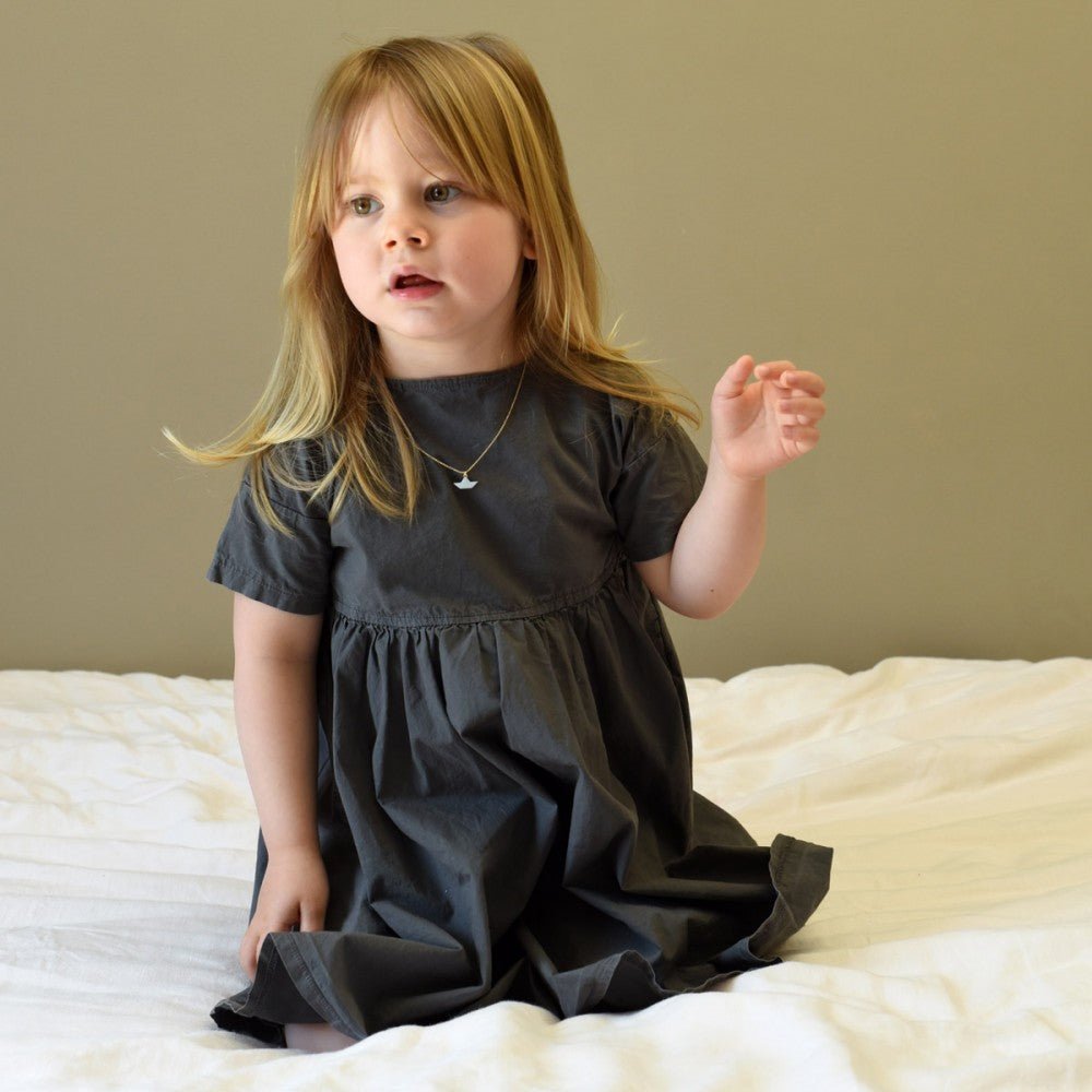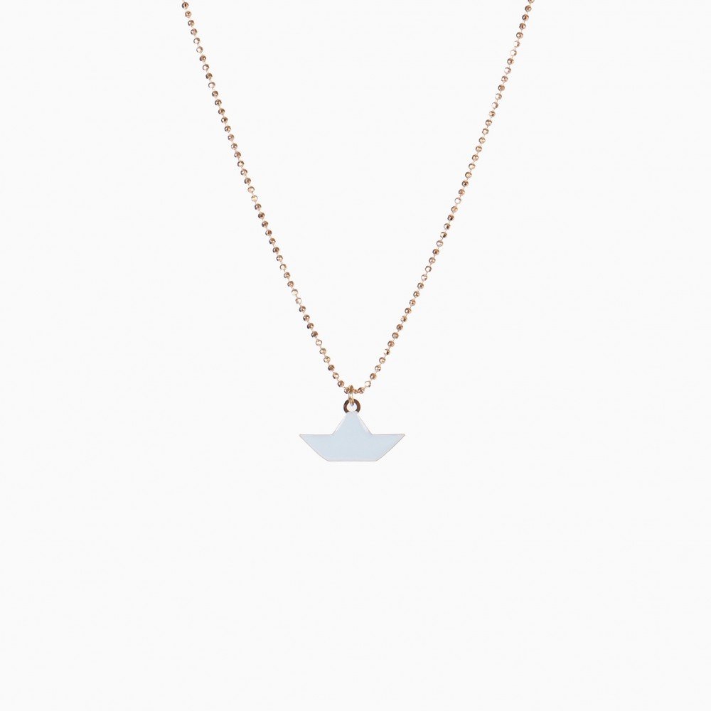 Atkins brings back memories of these rainy afternoons we spent folding paper, trying to make the perfect boat ! Necklace in gilt brass (24K gold) and light blue resin