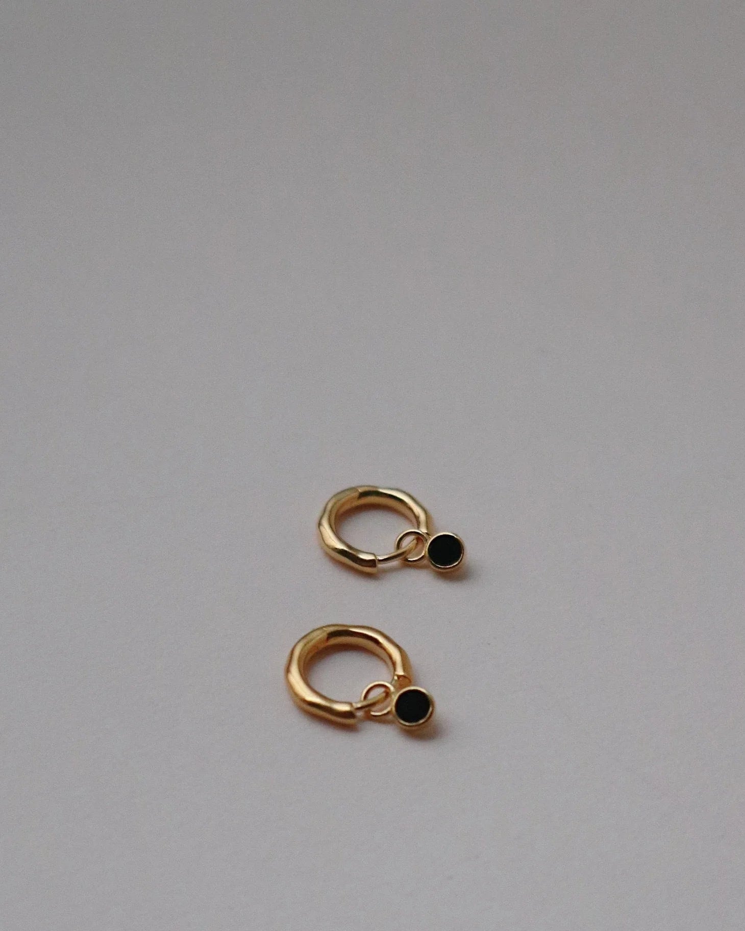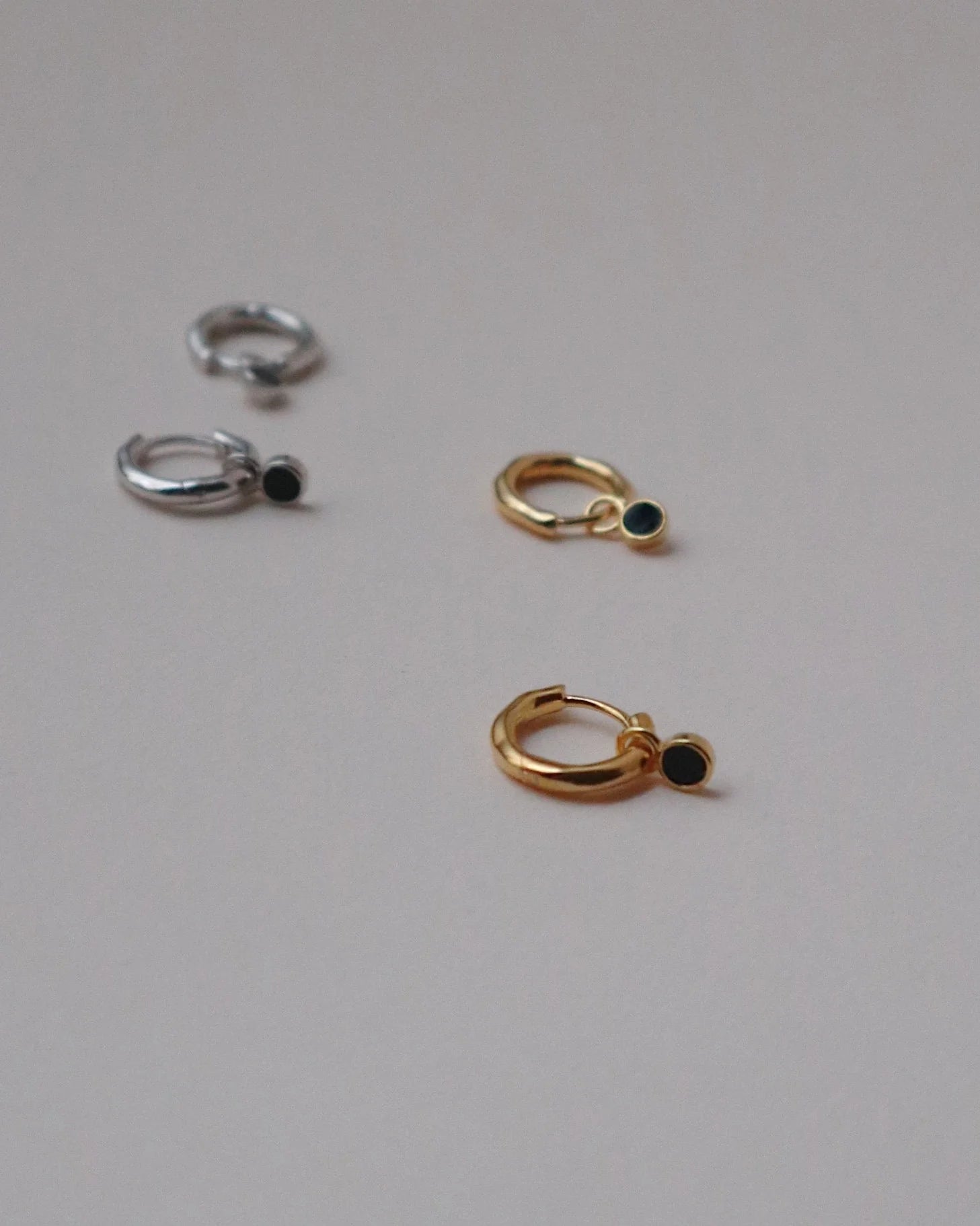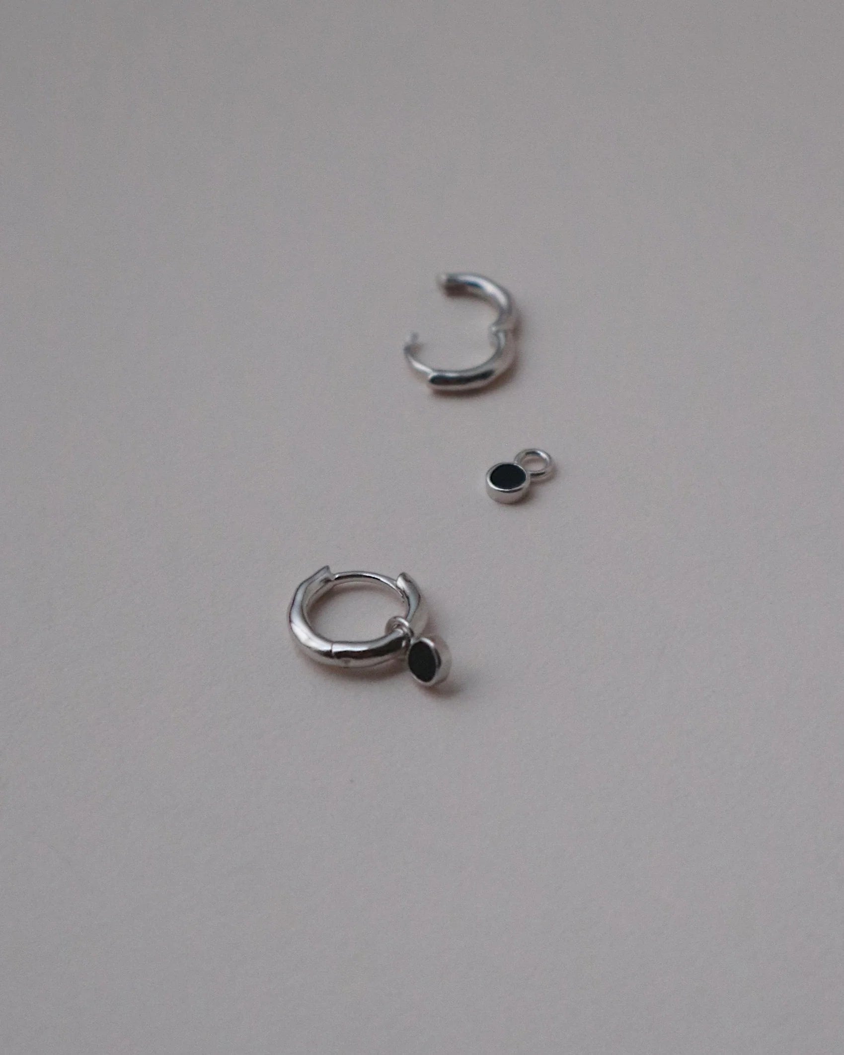 Minimalist but moving with molten metal- introducing our liquid huggie earrings. At 8mm in diameter, they'll loosely hug your ear. They have a spring hinge that clicks in position. Wear them alone as a simple huggie hoop or play dress up with one of our new charms.
