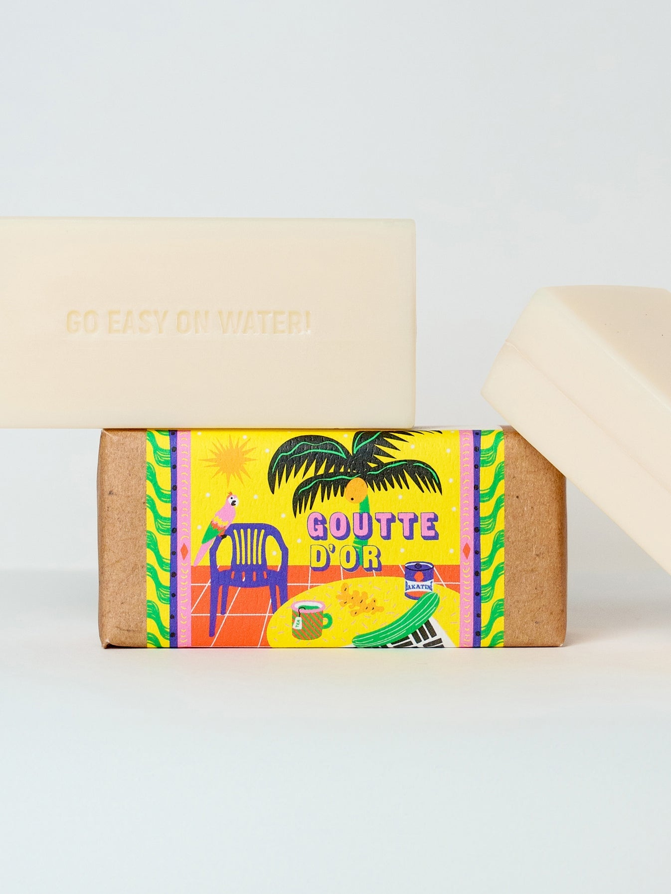 Spicy and refreshing notes of tea, ginger, and cucumber take you on a sensory trip around the world. This 100g soap is made with 96% natural ingredients, including olive and coconut oils, and is colorful and fragrant.