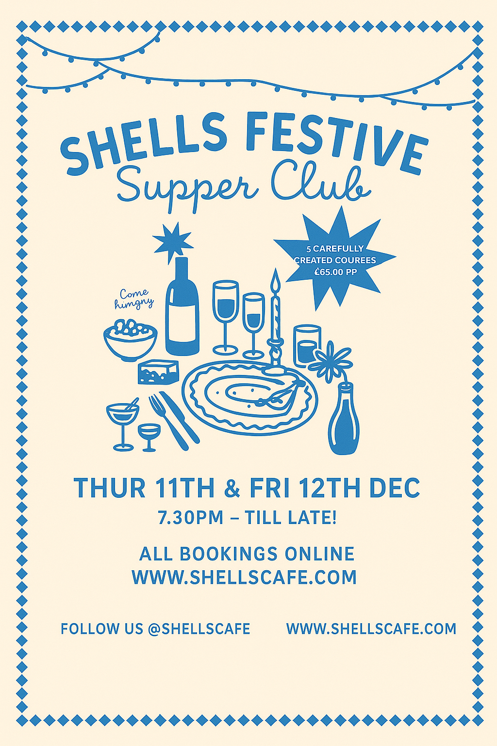 Come join us at Shells Cafe  for a night of delicious food and great company at our Festive Supper Club event! Indulge in a specially curated menu of seasonal dishes in a cozy and welcoming atmosphere. Whether you're a foodie looking to try something new or just want to enjoy a tasty meal with friends, this event is perfect for you. Don't miss out on this opportunity to celebrate the holiday season with good food and good vibes!