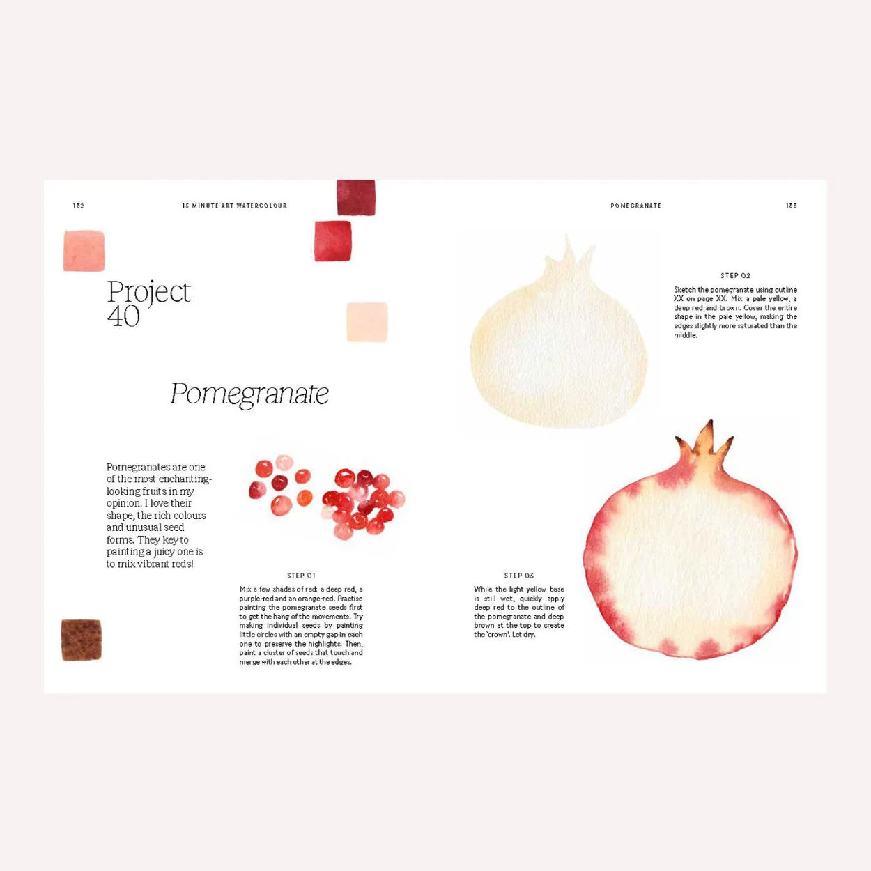 15 Minute Art Watercolour helps you explore watercolour through fifty quick and joyful projects. From fruits and flowers to animals and patterns, each six step lesson includes practice pages, colour tips, and traceable templates to make painting approachable and fun. A gentle guide to overcoming the blank page and adding creativity to your day in just minutes.